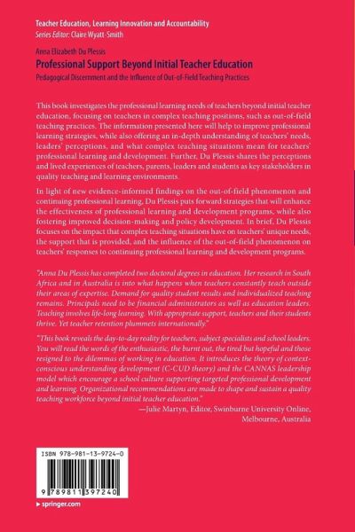 This book investigates the professional learning needs of teachers beyond initial teacher education, focusing on teachers in complex teaching positions, such as out-of-field teaching practices. The information presented here will help to improve professional learning strategies, while also offering an in-depth understanding of teachers' needs, leaders' perceptions, and what complex teaching situations mean for teachers' professional learning and development. Further, Du Plessis shares the perceptions and lived experiences of teachers, parents, leaders and students as key stakeholders in quality teaching and learning environments.