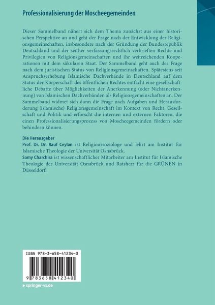 Dieser Sammelband nähert sich dem Thema zunächst aus einer historischen Perspektive an und geht der Frage nach der Entwicklung der Religionsgemeinschaften, insbesondere nach der Gründung der Bundesrepublik Deutschland und der seither verfassungsrechtlich verbrieften Rechte und Privilegien von Religionsgemeinschaften und ihr weitreichenden Kooperationen mit dem säkularen Staat. Der Sammelband geht auch der Frage nach dem juristischen Status von Religionsgemeinschaften. Spätestens seit Anspruchserhebung Islamische Dachverbände in Deutschland auf dem Status der Körperschaft des öffentlichen Rechtes entfacht eine gesellschaftliche Debatte über Möglichkeiten der Anerkennung (oder Nichtanerkennung) von Islamischen Dachverbänden als Religionsgemeinschaften an. Der Sammelband widmet sich dann die Frage nach Aufgaben und Herausforderung (islamische) Religionsgemeinschaft im Kontext von Recht, Gesellschaft und Politik und erforscht die internen und externen Faktoren, die einen Professionalisierungsprozess von Moscheegemeinden fördern oder behindern können.