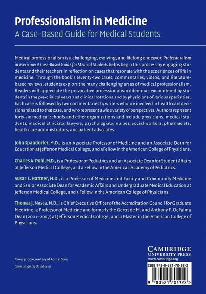 Learning medical professionalism is a challenging, evolving, and life-long endeavor. Professionalism in Medicine: A Case-Based Guide for Medical Students helps begin this process by engaging students and their teachers in reflection on cases that resonate with the experiences of life in medicine. Through the book's seventy-two cases, commentaries, videos, and literature-based reviews, students explore the many challenging areas of medical professionalism. Readers will appreciate the provocative professionalism dilemmas encountered by students from the pre-clinical years and clinical rotations and by physicians of various specialities. Each case is followed by two commentaries by writers who are involved in health care decisions related to that case, and who represent a wide variety of perspectives. Authors represent 46 medical schools and other institutions and include physicians, medical students, medical ethicists, lawyers, psychologists, nurses, social workers, pharmacists, health care administrators, and patient advocates.