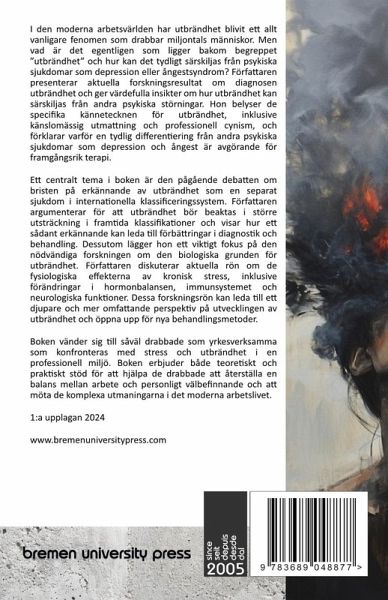 I den moderna arbetsvärlden har utbrändhet blivit ett allt vanligare fenomen som drabbar miljontals människor. Men vad är det egentligen som ligger bakom begreppet ¿utbrändhet¿ och hur kan det tydligt särskiljas från psykiska sjukdomar som depression eller ångestsyndrom? Författaren presenterar aktuella forskningsresultat om diagnosen utbrändhet och ger värdefulla insikter om hur utbrändhet kan särskiljas från andra psykiska störningar. Hon belyser de specifika kännetecknen för utbrändhet, inklusive känslomässig utmattning och professionell cynism, och förklarar varför en tydlig differentiering från andra psykiska sjukdomar som depression och ångest är avgörande för framgångsrik terapi. Ett centralt tema i boken är den pågående debatten om bristen på erkännande av utbrändhet som en separat sjukdom i internationella klassificeringssystem. Författaren argumenterar för att utbrändhet bör beaktas i större utsträckning i framtida klassifikationer och visar hur ett sådant erkännande kan leda till förbättringar i diagnostik och behandling. Dessutom lägger hon ett viktigt fokus på den nödvändiga forskningen om den biologiska grunden för utbrändhet. Författaren diskuterar aktuella rön om de fysiologiska effekterna av kronisk stress, inklusive förändringar i hormonbalansen, immunsystemet och neurologiska funktioner. Dessa forskningsrön kan leda till ett djupare och mer omfattande perspektiv på utvecklingen av utbrändhet och öppna upp för nya behandlingsmetoder. Boken vänder sig till såväl drabbade som yrkesverksamma som konfronteras med stress och utbrändhet i en professionell miljö. Boken erbjuder både teoretiskt och praktiskt stöd för att hjälpa de drabbade att återställa en balans mellan arbete och personligt välbefinnande och att möta de komplexa utmaningarna i det moderna arbetslivet.