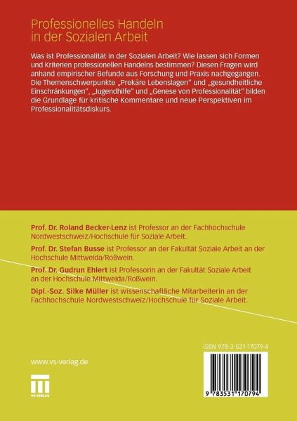Prof. Dr. Roland Becker-Lenz ist Professor an der Fachhochschule Nordwestschweiz / Hochschule für Soziale Arbeit. Prof. Dr. Stefan Busse ist Professor an der Fakultät Soziale Arbeit an der Hochschule Mittweida / Roßwein. Prof. Dr. Gudrun Ehlert ist Professorin an der Fakultät Soziale Arbeit an der Hochschule Mittweida / Roßwein. Dipl.-Soz. Silke Müller ist wissenschaftliche Mitarbeiterin an der Fachhochschule Nordwestschweiz / Hochschule für Soziale Arbeit.