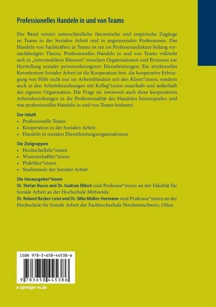 Einleitung: Professionelles Handeln in und von Teams.- Professionelle Teams und das Theorie-Praxis-Problem in der Sozialen Arbeit: Zwischen empirischer Werkstatt und theoretischer Modellbildung.- Teams in der Sozialen Arbeit - Eine Betrachtung aus der Perspektive der strukturtheoretischen Professionalisierungstheorie.- Diversität in der Sozialen Arbeit - das Team als Ort der Aushandlung gesellschaftlicher Spannungen.- Teamresilienz im Sozialen Dienst der Jugendämter.- Die organisationale Einbindung professioneller Teams im Spannungsfeld verschiedener Koordinationslogiken.- Die triadische Aufgabenstruktur professioneller Teams.- Teamarbeit ohne Teams?! Irritationen professionellen Handelns in der stationären Kinder- und Jugendhilfe.- «Erfolg, es zeichnet sich Erfolg ab» - zur Bedeutung der (inter-)professionellen Teamarbeit für nachhaltig wirksame Problemlösungen in der Sozialen Arbeit.- Teambezogene Strategien der Reflexion von professionellem Handeln am Beispiel Schulsozialarbeit.- Robotik und Soziale Arbeit- interdisziplinäre Teamentwicklungsprojekte.- Teamarbeit im Kontext. Ein Ansatz zur systematischen Bestimmung der Bedeutung von Teamarbeit in vielfältigen Handlungskontexten Sozialer Arbeit.- Funktion(en) von "Team" für die Bearbeitung von Arbeitsalltag - ein Blick in das Unterleben eines Jugendzentrums.