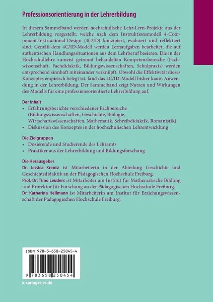 In diesem Sammelband werden hochschulische Lehr-Lern-Projekte aus der Lehrerbildung vorgestellt, welche nach dem Instruktionsmodell 4-Component-Instructional-Design (4C/ID) konzipiert, evaluiert und reflektiert sind. Gemäß dem 4C/ID-Modell werden Lernaufgaben bearbeitet, die auf authentischen Handlungssituationen aus dem Lehrberuf basieren. Die in der Hochschullehre zumeist getrennt behandelten Kompetenzbereiche (Fachwissenschaft, Fachdidaktik, Bildungswissenschaften, Schulpraxis) werden entsprechend sinnhaft miteinander verknüpft. Obwohl die Effektivität dieses Konzeptes empirisch belegt ist, fand das 4C/ID-Modell bisher kaum Anwendung in der Lehrerbildung. Der Sammelband zeigt Nutzen und Wirkungen des Modells für eine professionsorientierte Lehrerbildung auf.