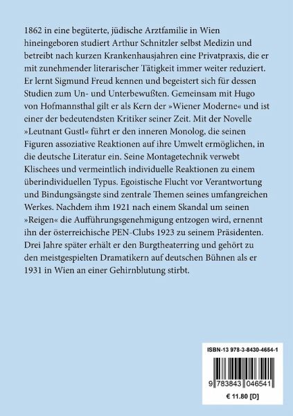 1862 in eine begüterte, jüdische Arztfamilie in Wien hineingeboren studiert Arthur Schnitzler selbst Medizin und betreibt nach kurzen Krankenhausjahren eine Privatpraxis, die er mit zunehmender literarischer Tätigkeit immer weiter reduziert. Er lernt Sigmund Freud kennen und begeistert sich für dessen Studien zum Un- und Unterbewußten. Gemeinsam mit Hugo von Hofmannsthal gilt er als Kern der "Wiener Moderne" und ist einer der bedeutendsten Kritiker seiner Zeit. Mit der Novelle "Leutnant Gustl" führt er den inneren Monolog, die seinen Figuren assoziative Reaktionen auf ihre Umwelt ermöglichen, in die deutsche Literatur ein. Seine Montagetechnik verwebt Klischees und vermeintlich individuelle Reaktionen zu einem überindividuellen Typus. Egoistische Flucht vor Verantwortung und Bindungsängste sind zentrale Themen seines umfangreichen Werkes. Nachdem ihm 1921 nach einem Skandal um seinen "Reigen" die Aufführungsgenehmigung entzogen wird, ernennt ihn der österreichische PEN-Clubs 1923 zu seinem Präsidenten. Drei Jahre später erhält er den Burgtheaterring und gehört zu den meistgespielten Dramatikern auf deutschen Bühnen als er 1931 in Wien an einer Gehirnblutung stirbt.