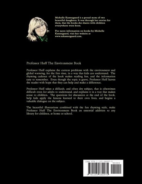 Professor Huff explains the current problems with the environment and global warming, for the first time, in a way that kids can understand. The rhyming cadence of the book makes reading fun, and the information easy to remember. Even though the topic is grave, Professor Huff leaves the reader with hope that they can help and make a difference. Professor Huff takes a difficult, and often dry subject, that is oftentimes difficult even for adults to understand, and explains it in a way that makes sense to children. The questions for discussion at the end of the book, help kids apply the lessons learned to their own lives, and begins a valuable dialogue on the subject. The beautiful illustrations combined with the fun rhyming style, make Professor Huff The Environment Book an essential addition to any library for children, at home or school.