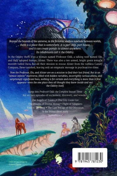 Beyond the bounds of the universe, in the formless, endless nowhere between worlds, there is a place that is somewhere. An anomaly of something in the nothing. It is part ship, part house, and it can create portals to almost anywhere. Its inhabitants call it the Oddity. A strange woman lives in the Oddity. Her name is Professor Odd, and she is a seasoned multiversal explorer. Her best friend also lives there. Her name is Elo, and she looks like a golden wolf-except she can stand on her hind legs and speak like a human. There is also Alister, a former university student who fled his home world when the sinister Canary Company marked him for elimination. And until recently there was Dave, the ten-armed, one-eyed, bright green tentacle monster with impressive knowledge of the multiverse. But in the fight for control of the Canary Company Dave vanished, leaving only an enigmatic message in psychoactive slime. Now the Professor, Elo, and Alister, are on a mission to find their lost friend, but in an "almost infinite" multiverse filled with hidden variables, incorrigibly curious aliens, and surprisingly significant bees, nothing is for certain and everything is more than it first appears-even the one place they all thought they knew inside and out: the Oddity itself. Jump into Professor Odd: The Complete Season Three for six new episodes of excitement, discovery, and wonder:13The Angels of Tyson 4 14The City Under Ice 15The Dreams of Doctor Morag 16Flight of Xifoptero 17Eyes in the Deep 18The Last Voyage of the Odyssean Followed by the bonus short story "Kumallinién."