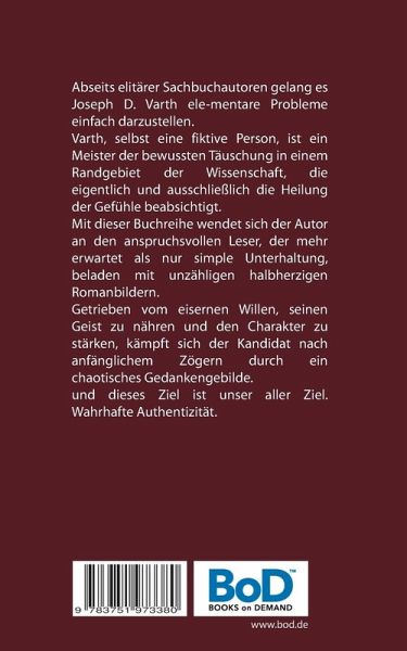 Abseits elitärer Sachbuchautoren gelang es Joseph D. Varth elementare Probleme einfach darzustellen.Varth, selbst eine fiktive Person, ist ein Meister der bewussten Täuschung in einem Randgebiet der Wissenschaft, die eigentlich und ausschließlich die Heilung der Gefühle beabsichtigt. Mit dieser Buchreihe wendet sich der Autor Michael Seegmüller an den anspruchsvollen Leser, der mehr erwartet als nur simple Unterhaltung, beladen mit unzähligen halbherzigen Romanbildern.
