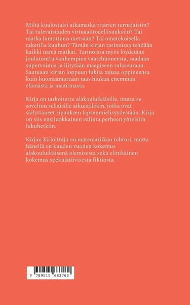Miltä kuulostaisi aikamatka ritarien turnajaisiin? Tai tulevaisuuden virtuaalitodellisuuksiin? Tai matka lumottuun metsään? Tai omatekoisella raketilla kuuhun? Tämän kirjan tarinoissa tehdään kaikki nämä matkat. Tarinoissa myös löydetään joulutonttu vanhempien vaatehuoneesta, saadaan supervoimia ja liitytään maagiseen salaseuraan. Saatuaan kirjan loppuun lukija tajuaa oppineensa kuin huomaamattaan taas hiukan enemmän elämästä ja maailmasta. Kirja on tarkoitettu alakouluikäisille, mutta se soveltuu sellaisille aikuisillekin, jotka ovat säilyttäneet ripauksen lapsenmielisyydestään. Kirja on siis ensiluokkainen valinta perheen yhteisiin lukuhetkiin. Kirjan kirjoittaja on matematiikan tohtori, mutta hänellä on kuuden vuoden kokemus alakouluikäisenä olemisesta sekä elinikäinen kokemus spekulatiivisesta fiktiosta.