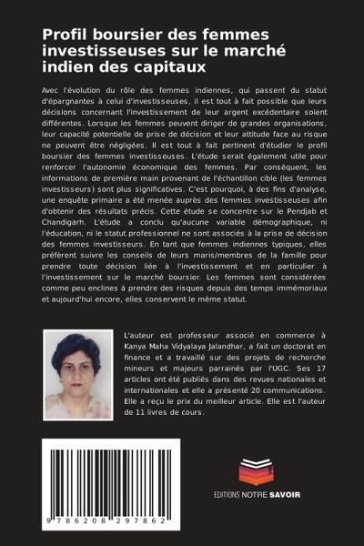 Avec l'évolution du rôle des femmes indiennes, qui passent du statut d'épargnantes à celui d'investisseuses, il est tout à fait possible que leurs décisions concernant l'investissement de leur argent excédentaire soient différentes. Lorsque les femmes peuvent diriger de grandes organisations, leur capacité potentielle de prise de décision et leur attitude face au risque ne peuvent être négligées. Il est tout à fait pertinent d'étudier le profil boursier des femmes investisseuses. L'étude serait également utile pour renforcer l'autonomie économique des femmes. Par conséquent, les informations de première main provenant de l'échantillon cible (les femmes investisseurs) sont plus significatives. C'est pourquoi, à des fins d'analyse, une enquête primaire a été menée auprès des femmes investisseuses afin d'obtenir des résultats précis. Cette étude se concentre sur le Pendjab et Chandigarh. L'étude a conclu qu'aucune variable démographique, ni l'éducation, ni le statut professionnel ne sont associés à la prise de décision des femmes investisseurs. En tant que femmes indiennes typiques, elles préfèrent suivre les conseils de leurs maris/membres de la famille pour prendre toute décision liée à l'investissement et en particulier à l'investissement sur le marché boursier. Les femmes sont considérées comme peu enclines à prendre des risques depuis des temps immémoriaux et aujourd'hui encore, elles conservent le même statut.