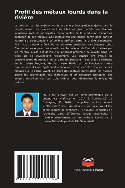 La pollution par les métaux lourds est une préoccupation majeure dans le monde actuel. Les rivières sont les sites les plus touchés, car diverses industries sont les principales responsables de la production d'énormes quantités de ces métaux. Ces métaux ont une longue persistance dans la nature, se bioaccumulent et se bioamplifient dans la chaîne alimentaire. Ainsi, ces métaux créent de nombreuses maladies cancérigènes chez l'homme et les organismes aquatiques. La pollution de l'eau des rivières par les métaux lourds est devenue le principal problème de qualité dans les villes qui se développent rapidement. Les auteurs ont évalué les concentrations de métaux lourds dans les poissons, l'eau et les sédiments de la rivière Meghna, de la rivière Halda et de l'ancienne rivière Brahmaputra. Ils ont également mentionné certains effets toxiques de ces métaux sur le corps vivant. Le profil des métaux lourds dans les rivières aidera les scientifiques, les chercheurs et les décideurs politiques. Les auteurs travaillent sur ces trois rivières pour déterminer le niveau de pollution.