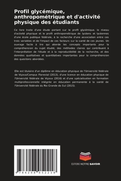 Ce livre traite d'une étude portant sur le profil glycémique, le niveau d'activité physique et le profil anthropométrique de lycéens et lycéennes d'une école publique fédérale, à la recherche d'une association entre ces trois variables et de l'impact de ces facteurs sur la santé de ces jeunes. Un ouvrage facile à lire qui aborde les concepts importants pour la compréhension du sujet étudié, des méthodes claires qui contribuent à l'interprétation de l'étude et à la reproductibilité de la recherche, et des données qualitatives et quantitatives importantes pour la compréhension des questions abordées.