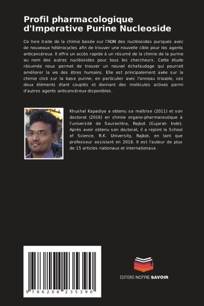 Ce livre traite de la chimie basée sur l'ADN des nucléosides puriques avec de nouveaux hétérocycles afin de trouver une nouvelle cible pour les agents anticancéreux. Il offre un accès rapide à un résumé de la chimie de la purine au nom des autres nucléosides pour tous les chercheurs. Cette étude résumée nous permet de trouver un nouvel échafaudage qui pourrait améliorer la vie des êtres humains. Elle est principalement axée sur la chimie click sur la base purine, en particulier avec l'anneau triazole, ces deux éléments étant couplés et donnant des molécules actives parmi d'autres agents anticancéreux disponibles.