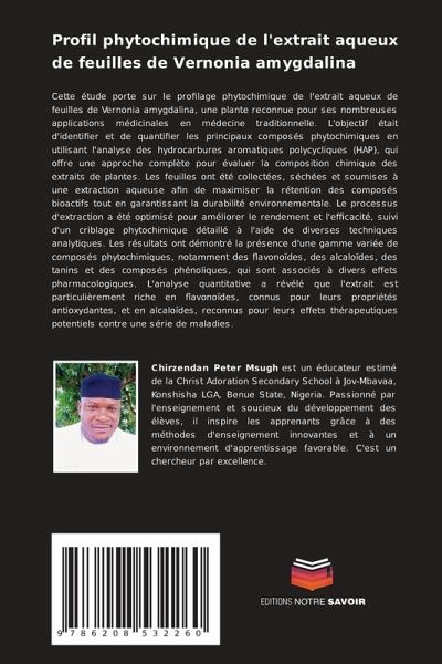 Cette étude porte sur le profilage phytochimique de l'extrait aqueux de feuilles de Vernonia amygdalina, une plante reconnue pour ses nombreuses applications médicinales en médecine traditionnelle. L'objectif était d'identifier et de quantifier les principaux composés phytochimiques en utilisant l'analyse des hydrocarbures aromatiques polycycliques (HAP), qui offre une approche complète pour évaluer la composition chimique des extraits de plantes. Les feuilles ont été collectées, séchées et soumises à une extraction aqueuse afin de maximiser la rétention des composés bioactifs tout en garantissant la durabilité environnementale. Le processus d'extraction a été optimisé pour améliorer le rendement et l'efficacité, suivi d'un criblage phytochimique détaillé à l'aide de diverses techniques analytiques. Les résultats ont démontré la présence d'une gamme variée de composés phytochimiques, notamment des flavonoïdes, des alcaloïdes, des tanins et des composés phénoliques, qui sont associés à divers effets pharmacologiques. L'analyse quantitative a révélé que l'extrait est particulièrement riche en flavonoïdes, connus pour leurs propriétés antioxydantes, et en alcaloïdes, reconnus pour leurs effets thérapeutiques potentiels contre une série de maladies.