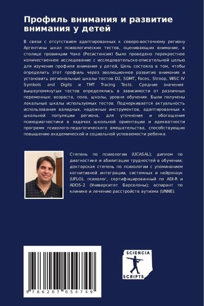 V swqzi s otsutstwiem adaptirowannyh k sewero-wostochnomu regionu Argentiny shkal psihologicheskih testow, oceniwaüschih wnimanie, w stolice prowincii Chako (Resistensiq) bylo prowedeno perekrestnoe kolichestwennoe issledowanie s issledowatel'sko-opisatel'noj cel'ü dlq izucheniq profilq wnimaniq u detej, Cel' sostoqla w tom, chtoby opredelit' ätot profil' cherez äwolücionnoe razwitie wnimaniq i ustanowit' regional'nye shkaly testow D2, SDMT, Faces, Stroop, WISC IV Symbols and Digits i TMT Tracing Tests. Srednie znacheniq wysheupomqnutyh testow opredelqlis' w zawisimosti ot razlichnyh peremennyh: wozrasta, pola, shkoly, urownq obucheniq. Byli polucheny lokal'nye shkaly ispol'zuemyh testow. Podcherkiwaetsq aktual'nost' ispol'zowaniq walidnyh, nadezhnyh instrumentow, adaptirowannyh k shkol'noj populqcii regiona, dlq utochneniq i obogascheniq psihodiagnostiki w zadachah shkol'noj orientacii i adekwatnosti programm psihologo-pedagogicheskogo wmeshatel'stwa, sposobstwuüschih powysheniü akademicheskoj i social'noj uspewaemosti rebenka.