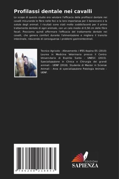 Lo scopo di questo studio era valutare l'efficacia della profilassi dentale nei cavalli misurando le fibre nelle feci e la loro importanza per il benessere e la salute degli animali. I risultati sono stati molto soddisfacenti per il primo trattamento dentale di ogni animale, con un calo medio di 0,58 cm delle fibre fecali. Possiamo quindi affermare l'efficacia del trattamento dentale nei cavalli, che genera comfort durante l'alimentazione e migliora il transito intestinale, riducendo di conseguenza i problemi gastrointestinali.