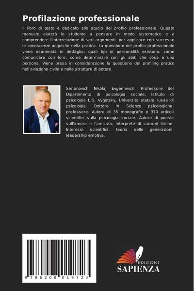 Il libro di testo è dedicato allo studio del profilo professionale. Questo manuale aiuterà lo studente a pensare in modo sistematico e a comprendere l'interrelazione di vari argomenti, per applicare con successo le conoscenze acquisite nella pratica. La questione del profilo professionale viene esaminata in dettaglio: quali tipi di personalità esistono, come comunicare con loro, come determinare con gli abiti che cosa è una persona. Viene presa in considerazione la questione del profiling pratico nell'aviazione civile e nelle strutture di potere.