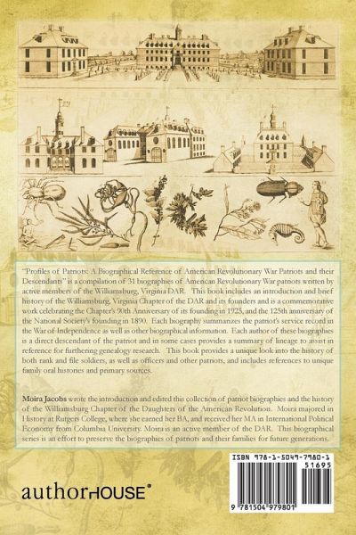Profiles of Patriots: A Biographical Reference of American Revolutionary War Patriots and their Descendants is a compilation of thirty-one biographies of American Revolutionary War patriots and includes an introduction and brief history of the Williamsburg, Virginia, chapter of the DAR and its founders. This book is a commemorative work celebrating the chapter's 90th anniversary of its founding in 1925 and the 125th anniversary of the National Society's founding in 1890. Each biography summarizes the patriot's service record in the War of Independence, as well as key biographical information. In addition, each author of these biographies is a direct descendant of the patriot and in some cases provides a summary of lineage to assist in reference for furthering genealogy research. This book provides a unique look into the history of both rank-and-file soldiers, as well as officers and other patriots, and includes references to unique family oral histories and primary sources.