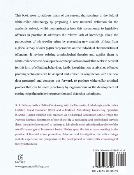 This book seeks to address many of the current shortcomings in the field of white-collar criminology by proposing a new universal definition for the academic subject, whilst demonstrating how this corresponds to legislative offences in practice. It addresses the relative lack of knowledge about the perpetrators of white-collar crime by presenting new analysis of data from a global survey of over 5,400 corporations on the individual characteristics of offenders. It also reviews existing criminological theories and applies them to white-collar crime to develp a new conceptual framework that seeks to account for this form of offending behaviour. Lastly, it explains how established offender profiling techniques can be adapted and utilised in conjunction with the new data presented and concepts put forward, to produce white-collar criminal profiles that can be used proactively by organisations in the development of cutting-edge financial crime prevention and detection techniques. About the author R. A. Bethune holds a PhD in Criminology with the University of Edinburgh, and is both a Certified Fraud Examiner (CFE) and a Certified Anti-Money Laundering Specialist (CAMS). Having qualified and practiced as a Chartered Accountant (ACA) within the Forensic Services department of one of the Big 4 accounting and professional services firms, the author later moved to industry to join the financial crime function of one of the world's largest global investment banks. Having spent the last 12 years working in the practice of financial crime prevention, detection and investigation, the author brings real-life experience and perspective to the development of white-collar criminological theory in this book.