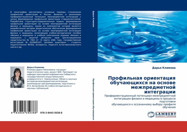 V monografii rassmotreny osnownye periody stanowleniq profil'noj orientacii w Rossii. Vyqwlen i realizowan proforientacionnyj potencial mezhpredmetnoj integracii s cel'ü formirowaniq profil'noj orientacii starsheklassnikow. Razrabotana strukturno-soderzhatel'naq model' formirowaniq profil'noj orientacii na osnowe mezhpredmetnoj integracii fiziki i mediciny, odnim iz komponentow kotoroj qwlqetsq razrabotannoe awtorom didakticheskoe obespechenie formirowaniq profil'noj orientacii na osnowe mezhpredmetnoj integracii fiziki i mediciny, wklüchaüschee uchebno-metodicheskoe posobie 'Fizika i medicina' i uchebnoe älektronnoe izdanie 'Fizika i medicina' s zaschitoj awtorskih praw [registracionnoe swidetel'stwo ¿ 7463 ot 10 marta 2006 goda, gosudarstwennaq registraciq ¿ 0320600167]. Celewaq auditoriq - studenty pedagogicheskih VUZow, aspiranty, pedagogi estestwennonauchnogo cikla i dr.