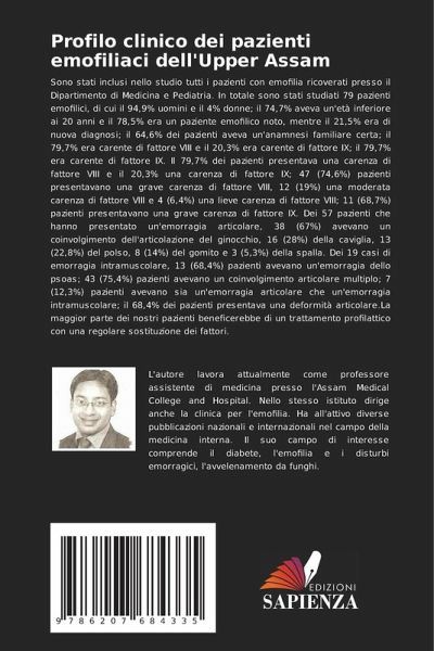 Sono stati inclusi nello studio tutti i pazienti con emofilia ricoverati presso il Dipartimento di Medicina e Pediatria. In totale sono stati studiati 79 pazienti emofilici, di cui il 94,9% uomini e il 4% donne; il 74,7% aveva un'età inferiore ai 20 anni e il 78,5% era un paziente emofilico noto, mentre il 21,5% era di nuova diagnosi; il 64,6% dei pazienti aveva un'anamnesi familiare certa; il 79,7% era carente di fattore VIII e il 20,3% era carente di fattore IX; il 79,7% era carente di fattore IX. Il 79,7% dei pazienti presentava una carenza di fattore VIII e il 20,3% una carenza di fattore IX; 47 (74,6%) pazienti presentavano una grave carenza di fattore VIII, 12 (19%) una moderata carenza di fattore VIII e 4 (6,4%) una lieve carenza di fattore VIII; 11 (68,7%) pazienti presentavano una grave carenza di fattore IX. Dei 57 pazienti che hanno presentato un'emorragia articolare, 38 (67%) avevano un coinvolgimento dell'articolazione del ginocchio, 16 (28%) della caviglia, 13 (22,8%) del polso, 8 (14%) del gomito e 3 (5,3%) della spalla. Dei 19 casi di emorragia intramuscolare, 13 (68,4%) pazienti avevano un'emorragia dello psoas; 43 (75,4%) pazienti avevano un coinvolgimento articolare multiplo; 7 (12,3%) pazienti avevano sia un'emorragia articolare che un'emorragia intramuscolare; il 68,4% dei pazienti presentava una deformità articolare.La maggior parte dei nostri pazienti beneficerebbe di un trattamento profilattico con una regolare sostituzione dei fattori.