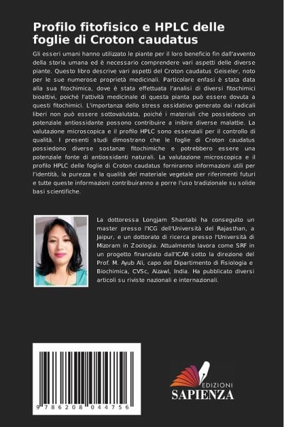 Gli esseri umani hanno utilizzato le piante per il loro beneficio fin dall'avvento della storia umana ed è necessario comprendere vari aspetti delle diverse piante. Questo libro descrive vari aspetti del Croton caudatus Geiseler, noto per le sue numerose proprietà medicinali. Particolare enfasi è stata data alla sua fitochimica, dove è stata effettuata l'analisi di diversi fitochimici bioattivi, poiché l'attività medicinale di questa pianta può essere dovuta a questi fitochimici. L'importanza dello stress ossidativo generato dai radicali liberi non può essere sottovalutata, poiché i materiali che possiedono un potenziale antiossidante possono contribuire a inibire diverse malattie. La valutazione microscopica e il profilo HPLC sono essenziali per il controllo di qualità. I presenti studi dimostrano che le foglie di Croton caudatus possiedono diverse sostanze fitochimiche e potrebbero essere una potenziale fonte di antiossidanti naturali. La valutazione microscopica e il profilo HPLC delle foglie di Croton caudatus forniranno informazioni utili per l'identità, la purezza e la qualità del materiale vegetale per riferimenti futuri e tutte queste informazioni contribuiranno a porre l'uso tradizionale su solide basi scientifiche.