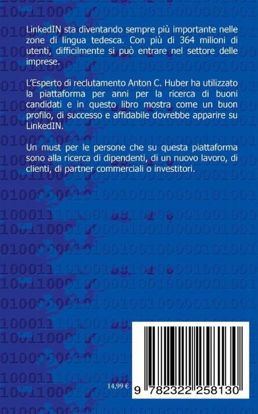 LinkedIN sta diventando sempre più importante nelle zone di lingua tedesca. Con più di 364 milioni di utenti, difficilmente si può entrare nel settore delle imprese. L'Esperto di reclutamento Anton C. Huber ha utilizzato la piattaforma per anni per la ricerca di buoni candidati e in questo libro mostra come un buon profilo, di successo e affidabile dovrebbe apparire su LinkedIN. Un must per le persone che su questa piattaforma sono alla ricerca di dipendenti, di un nuovo lavoro, di clienti, di partner commerciali o investitori.