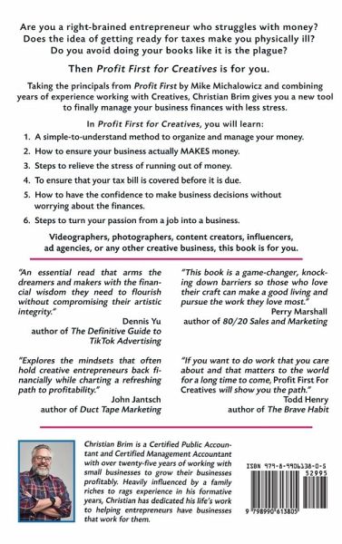 Are you a right-brained entrepreneur who struggles with money? Does the idea of getting ready for taxes make you physically ill? Do you avoid doing your books like it is the plague? Then Profit First for Creatives is for you. Taking the principals from Profit First by Mike Michalowicz and combining years of experience working with Creatives, Christian Brim gives you a new tool to finally manage your business finances with less stress. In Profit First for Creatives, you will learn: 1. A simple-to-understand method to organize and manage your money. 2. How to ensure your business actually MAKES money. 3. Steps to relieve the stress of running out of money. 4. To ensure that your tax bill is covered before it is due. 5. How to have the confidence to make business decisions without worrying about the finances. 6. Steps to turn your passion from a job into a business. Videographers, photographers, content creators, influencers, ad agencies, or any other creative business, this book is for you. Christian Brim is a Certified Public Accountant and Certified Management Accountant with over twenty-five years of working with small businesses to grow their businesses profitably. Heavily influenced by a family riches to rags experience in his formative years, Christian has dedicated his life's work to helping entrepreneurs have businesses that work for them.