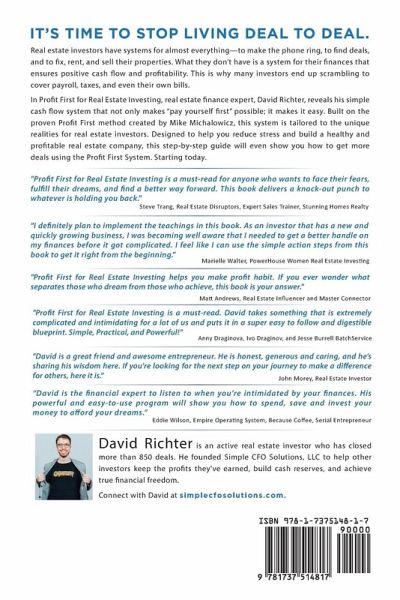 It's time to stop living deal to deal. Real estate investors have systems for almost everything-to make the phone ring, to find deals, and to fix, rent, and sell their properties. What they don't have is a system for their finances that ensures positive cash flow and profitability. This is why many investors end up scrambling to cover payroll, taxes, and even their own bills. In Profit First for Real Estate Investing, real estate finance expert, David Richter, reveals his simple cash flow system that not only makes "pay yourself first" possible; it makes it easy. Built on the proven Profit First method created by Mike Michalowicz, this system is tailored to the unique realities for real estate investors. Designed to help you reduce stress and build a healthy and profitable real estate company, this step-by-step guide will even show you how to get more deals using the Profit First System. Starting today.
