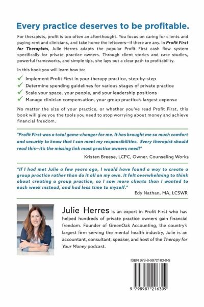 Every practice deserves to be profitable. For therapists, profit is too often an afterthought. You focus on caring for clients and paying rent and clinicians, and take home the leftovers-if there are any. In Profit First for Therapists, Julie Herres adapts the popular Profit First cash flow system specifically for private practice owners. Through client stories and case studies, powerful frameworks, and simple tips, she lays out a clear path to profitability. In this book, you will learn how to:Implement Profit First in your therapy practice, step by step Determine spending guidelines for various stages of private practice Scale your space, your people, and your leadership positions Manage clinician compensation, your group practice's largest expense No matter the size of your practice, or whether you've read Profit First, this book will give you the tools you need to stop worrying about money and achieve financial freedom.