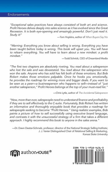 Profit Heroes addresses a new "call to arms" that is transforming selling. To thrive in the future, salespeople must understand how customers are changing and what it will take to win. It is no longer about your company against mine, or your products and services against mine, or your know-how against mine. It is now all about profitability and the ability to identify it, quantify it, sell it and deliver it. To win you must be viewed by customers as more than "a vendor." You must now become "an earnings contributor". The book offers a unique inside and emotional view of two competing salespeople who faced off in the pursuit of a big opportunity. Both represent great companies. Both are highly talented and successful. One wins and one loses. Theirs is a classic competition you see every day in American business, and is what makes selling the most exciting profession in the world. The book unveils the strategies and approaches that the winner and all Profit Heroes use to achieve success. Endorsements "Profit Heroes uncovers the secret of selling true value. It is a transformation in selling concepts that drives measurable results." Kim Hartwell, Senior Vice President, Global Sales and Marketing, ADC Corporation "Bob's focus on 'profit' could not be more on-target. In a recent dialogue with industry CEO's, there was 'table-pounding' agreement that all employees including sales, marketing, finance, operations, HR and IT, must all know how they impact profit improvement". Dr. Douglas A. Fisher, Assistant Professor and Director - Center for Supply Chain Management, College of Business Administration, Marquette University Profit Heroes describes how sales losers can become sales winners, even in a rapidly changing business world. Geoffrey James, author of Business Without the Bullsh*t