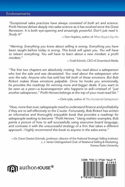 Profit Heroes addresses a new "call to arms" that is transforming selling. To thrive in the future, salespeople must understand how customers are changing and what it will take to win. It is no longer about your company against mine, or your products and services against mine, or your know-how against mine. It is now all about profitability and the ability to identify it, quantify it, sell it and deliver it. To win you must be viewed by customers as more than "a vendor." You must now become "an earnings contributor". The book offers a unique inside and emotional view of two competing salespeople who faced off in the pursuit of a big opportunity. Both represent great companies. Both are highly talented and successful. One wins and one loses. Theirs is a classic competition you see every day in American business, and is what makes selling the most exciting profession in the world. The book unveils the strategies and approaches that the winner and all Profit Heroes use to achieve success. Endorsements "Profit Heroes uncovers the secret of selling true value. It is a transformation in selling concepts that drives measurable results." Kim Hartwell, Senior Vice President, Global Sales and Marketing, ADC Corporation "Bob's focus on 'profit' could not be more on-target. In a recent dialogue with industry CEO's, there was 'table-pounding' agreement that all employees including sales, marketing, finance, operations, HR and IT, must all know how they impact profit improvement". Dr. Douglas A. Fisher, Assistant Professor and Director - Center for Supply Chain Management, College of Business Administration, Marquette University Profit Heroes describes how sales losers can become sales winners, even in a rapidly changing business world. Geoffrey James, author of Business Without the Bullsh*t