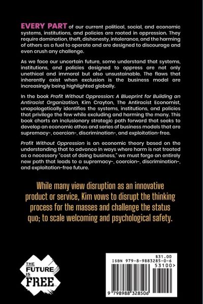 EVERY PART of our current political, social, and economic systems, institutions, and policies are rooted in oppression. They require domination, theft, dishonesty, intolerance, and the harming of others as a fuel to operate and are designed to discourage and even crush any challenge. As we face our uncertain future, some understand that systems, institutions, and policies designed to oppress are not only unethical and immoral but also unsustainable. The flaws that inherently exist when exclusion is the business model are increasingly being highlighted globally. In the book Profit Without Oppression: A Blueprint for Building an Antiracist Organization, Kim Crayton, The Antiracist Economist, unapologetically identifies the systems, institutions, and policies that privilege the few while excluding and harming the many. This book charts an inclusionary strategic path forward that seeks to develop an economic ethos and series of business models that are supremacy-, coercion-, discrimination-, and exploitation-free. Profit Without Oppression is an economic theory based on the understanding that to advance in ways where harm is not treated as a necessary "cost of doing business," we must forge an entirely new path that leads to a supremacy-, coercion-, discrimination-, and exploitation-free future.
