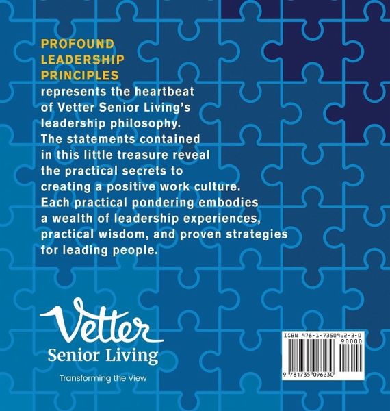 Profound Leadership Principles represents the heartbeat of Vetter Senior Living's leadership philosophy. The statements contained in this little treasure reveal the practical secrets to creating a positive work culture. Each practical pondering embodies a wealth of leadership experiences, practical wisdom, and proven strategies for leading people.
