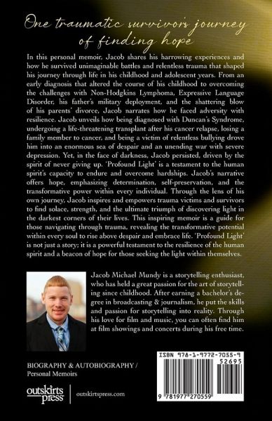 Jacob Michael Mundy is an inspiring author and a resilient cancer warrior who has conquered life's immense challenges, emerging victorious since being declared cancer-free in 2013. Currently residing in the Quad Cities, he uses his passion for the storytelling medium and skills learned to help bring extraordinary stories to the local community in his job at a television station. Armed with an Associate in Arts and a Bachelor of Arts, he translates his passion for storytelling into a compelling narrative of survival and triumph. In his powerful debut autobiography Profound Light, Jacob delves into his journey, recounting a life marked by trauma in his childhood and adolescent years, including his early two battles with Non-Hodgkins lymphoma, struggles with developmental delays, his parents' divorce, facing Duncan's syndrome, becoming a victim of severe bullying, and many more battles in between. Through the darkest times, he discovered hope, determination, and the power of human transformation. This debut memoir is a beacon of inspiration for trauma victims and survivors, emphasizing the resilience of the human spirit. Jacob finds joy in diverse interests outside his literary pursuits, from movie theaters and concerts to hiking outdoors, exploring amusement parks, listening to music, and playing the guitar. His love for storytelling extends beyond the pages of his memoir, making him a passionate advocate for trauma survivors and a testament to a life reclaimed from adversity.