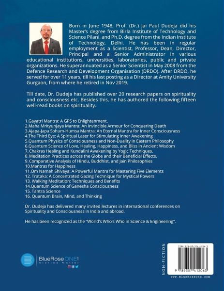 "Born in June 1948, Prof. (Dr.) Jai Paul Dudeja holds a brilliant academic record. He did his Master's degree from Birla Institute of Technology and Science (BITS), Pilani (India), and Ph.D. degree from the Indian Institute of Technology (IIT), Delhi. He has been in regular employment as a Scientist, Professor, Dean, Director, Principal, and a Senior Administrator in various educational institutions, universities, laboratories, public and private organizations. He superannuated as a Senior Scientist and Additional Director in May 2008 from the Defence Research and Development Organisation (DRDO), Government of India. After DRDO, he served for over 11 years, till his last posting as a Director at Amity University Gurgaon, from where he retired in Nov 2019.Till date, Dr. Dudeja has published/presented over 20 research papers on spirituality and consciousness etc. Besides this, he has authored sixteen books on spirituality."