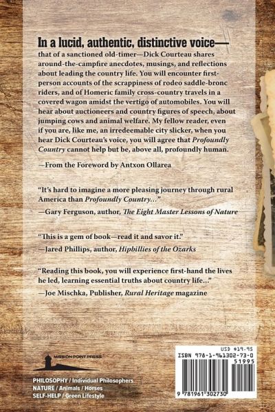 When you read this book, you will hear, in your mind's ear, a lucid, authentic, distinctive voice. It is the around-the-campfire voice of a sanctioned old-timer. You are going to be captivated by the voice's rhythm, and awed by its precision, and you will be, without a doubt, amused by its wit and humor. Dick Courteau is going to share anecdotes, musings, and reflections about leading the country life and about your country neighbors' adeptness, the craft of their language, their humility, and their deep respect for others. You will listen, to temp you but with a few vignettes, to the psychological insights of horse country auctioneers, and the wisdom and mercy of one-armed country judges. You are going to encounter first-person accounts of the scrappiness of rodeo saddle bronc riders, and of family Homeric cross-country travels in a covered wagon amidst the vertigo of automobiles. You may even get practical advice along the way in case you are in dire need of acquiring teamster skills. Horses will fall in love in this book, but no, cows will not be jumping over the moon. Cows will leap out of small unbarred barn windows. And so they should. Even if you are an unredeemable city slicker who cannot tell apart a breeching ring from an engagement one, when you hear Dick Courteau's voice you will agree that Profoundly Country cannot help but be, above all, profoundly human.