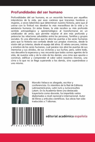 Profundidades del ser humano, es un recorrido hermoso por aquellos intersticios de la vida, por esos caminos que trazamos hombres y mujeres, a veces laberintos que determinan nuestra historia, pero que al unirse con la finitud nos develan lo más maravilloso de la vida y la existencia humana. En estas líneas, la vida recobra su más profundo sentido antropológico y epistemológico al transformarse en un catalizador de amor, que permite respirar el aire más profundo y potenciar las relaciones saludables entre las personas, familias y grupos sociales. Es una alternativa que le abre las puertas a los seres humanos para que la historia sea contada desde sus propias vivencias, desde la visión del yo interior, desde el espejo del alma. El relato cercano, íntimo y emotivo de los seres humanos, cual paraíso nos abre las puertas de sus memorias y sus olvidos, de sus victorias y sus luchas; pero, sobre todo, nos devuelve la esperanza y nos recuerda que todos somos agentes de la vida, de nuestra vida y de la vida de los demás; una cima que apunta a construir, edificar y comprender el valor sobre nosotros mismos, una cima a la que no se llega superando a los demás, sino superándose a uno mismo.