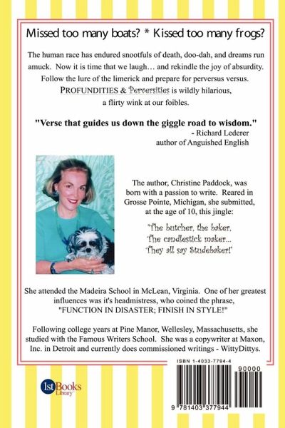 "Verse that guides us down the giggle road to Wisdom." Richard Lederer Author of Anguished English "Author, Christine Paddock, is today's Dorothy Parker; I'd sure like to get a good look at the inside of her head." Leigh Sherman