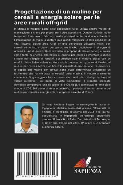 In Etiopia la maggior parte delle popolazioni rurali utilizza ancora metodi di macinazione a mano per preparare il cibo quotidiano. Questo richiede molto tempo ed è un lavoro faticoso, svolto principalmente da donne e bambini. L'introduzione di mulini a motore può quindi migliorare le loro condizioni di vita. Tuttavia, poche aree rurali off-grid dell'Etiopia utilizzano mulini per cereali alimentati a diesel per preparare il cibo quotidiano; il villaggio di Amasri è uno di questi. Questo studio si propone di fornire l'energia solare come fonte di energia alternativa al mulino per cereali alimentato a diesel situato nel villaggio di Amasri, sostituendo solo il motore diesel con un modulo fotovoltaico solare e riducendo la potenza in ingresso richiesta dal mulino per cereali senza modificare la capacità di macinazione. La potenza e la coppia del mulino per cereali sono state determinate utilizzando un tachimetro che ha misurato la velocità della macina. Il motore a corrente continua e l'ingranaggio cilindrico sono stati scelti dal catalogo in base al valore calcolato... Dal punto di vista ambientale, il progetto proposto dovrebbe comportare una riduzione di 5400 kg (5,4 tonnellate) di emissioni annue di CO2. Dal punto di vista economico, il periodo di ammortamento del mulino per cereali a energia solare proposto sarebbe di 2 anni.