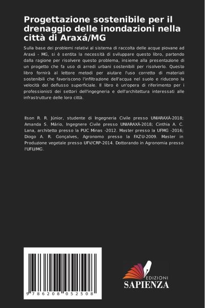 Sulla base dei problemi relativi al sistema di raccolta delle acque piovane ad Araxá - MG, si è sentita la necessità di sviluppare questo libro, partendo dalla ragione per risolvere questo problema, insieme alla presentazione di un progetto che fa uso di arredi urbani sostenibili per risolverlo. Questo libro fornirà al lettore metodi per aiutare l'uso corretto di materiali sostenibili che favoriscono l'infiltrazione dell'acqua nel suolo e riducono la velocità del deflusso superficiale. Il libro è un'opera di riferimento per i professionisti dei settori dell'ingegneria e dell'architettura interessati alle infrastrutture delle loro città.