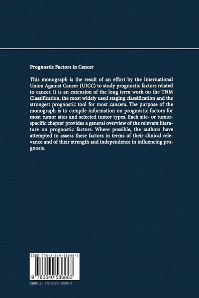 This monograph is the result of an effort by the International Union Against Cancer (UICC) to study prognostic factors related to cancer. It is an extension of the long-term work on the TNM Classification, the most widely used staging classification and the strongest prognostic tool for most cancers. The purpose of the monograph is to compile information on prognostic factors for most tumor sites and selected tumor types. Each site- or tumor-specific chapter provides a general overview of the relevant literature on prognostic factors. Where possible, the authors have attempted to assess these factors in terms of their clinical relevance and of their strength and independence in influencing prognosis.