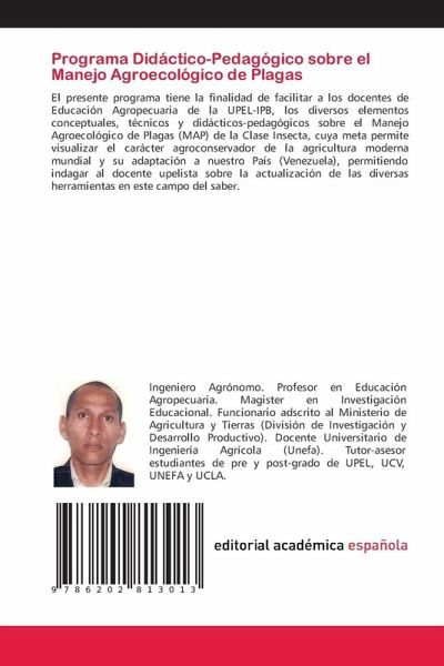 El presente programa tiene la finalidad de facilitar a los docentes de Educación Agropecuaria de la UPEL-IPB, los diversos elementos conceptuales, técnicos y didácticos-pedagógicos sobre el Manejo Agroecológico de Plagas (MAP) de la Clase Insecta, cuya meta permite visualizar el carácter agroconservador de la agricultura moderna mundial y su adaptación a nuestro País (Venezuela), permitiendo indagar al docente upelista sobre la actualización de las diversas herramientas en este campo del saber.