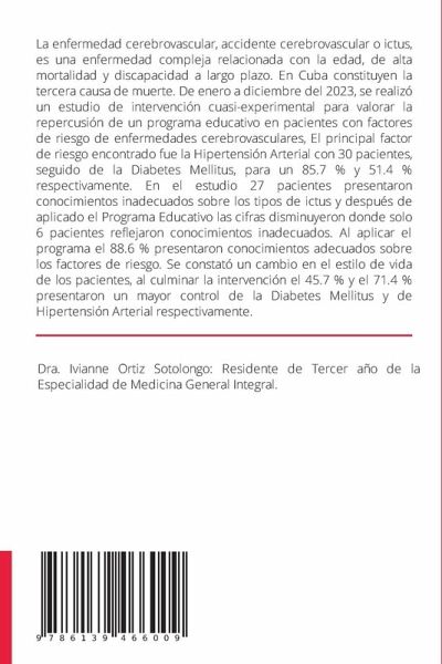 La enfermedad cerebrovascular, accidente cerebrovascular o ictus, es una enfermedad compleja relacionada con la edad, de alta mortalidad y discapacidad a largo plazo. En Cuba constituyen la tercera causa de muerte. De enero a diciembre del 2023, se realizó un estudio de intervención cuasi-experimental para valorar la repercusión de un programa educativo en pacientes con factores de riesgo de enfermedades cerebrovasculares, El principal factor de riesgo encontrado fue la Hipertensión Arterial con 30 pacientes, seguido de la Diabetes Mellitus, para un 85.7 % y 51.4 % respectivamente. En el estudio 27 pacientes presentaron conocimientos inadecuados sobre los tipos de ictus y después de aplicado el Programa Educativo las cifras disminuyeron donde solo 6 pacientes reflejaron conocimientos inadecuados. Al aplicar el programa el 88.6 % presentaron conocimientos adecuados sobre los factores de riesgo. Se constató un cambio en el estilo de vida de los pacientes, al culminar la intervención el 45.7 % y el 71.4 % presentaron un mayor control de la Diabetes Mellitus y de Hipertensión Arterial respectivamente.
