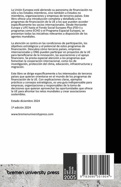 La Unión Europea está abriendo su panorama de financiación no sólo a los Estados miembros, sino también a Estados no miembros, organizaciones y empresas de terceros países. Este libro ofrece una introducción completa y detallada a los programas de financiación de la UE a los que pueden acceder específicamente los socios internacionales. Desde Horizonte Europa y LIFE hasta el Fondo Social Europeo Plus (FSE+) y programas como ECHO o el Programa Espacial Europeo, se presentan todas las iniciativas relevantes a disposición de los agentes mundiales. La atención se centra en las condiciones de participación, los objetivos estratégicos y el potencial de estos programas de financiación. Descubra cómo terceros países, empresas internacionales y ONG pueden participar en proyectos de la UE para beneficiarse de la innovación, las asociaciones y el apoyo financiero. Se presta especial atención a los programas que fomentan la cooperación internacional, como los de investigación, protección del clima, educación, infraestructuras y migración. Este libro se dirige específicamente a los interesados de terceros países que quieran orientarse en el mundo de los programas de financiación de la UE. Con explicaciones claras, ejemplos prácticos y consejos estratégicos, es una guía indispensable para empresas, organizaciones y responsables de la toma de decisiones que quieran aprovechar las oportunidades que ofrece la UE para afrontar los retos mundiales y crear asociaciones sostenibles. Estado diciembre 2024