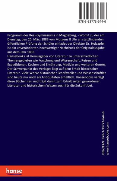 Programm des Real-Gymnasiums in Magdeburg, - Womit zu der am Dienstag, den 20. März 1883 von Morgens 8 Uhr an stattfindenden öffentlichen Prüfung der Schüler einladet der Direktor Dr. Holzapfel ist ein unveränderter, hochwertiger Nachdruck der Originalausgabe aus dem Jahr 1883.