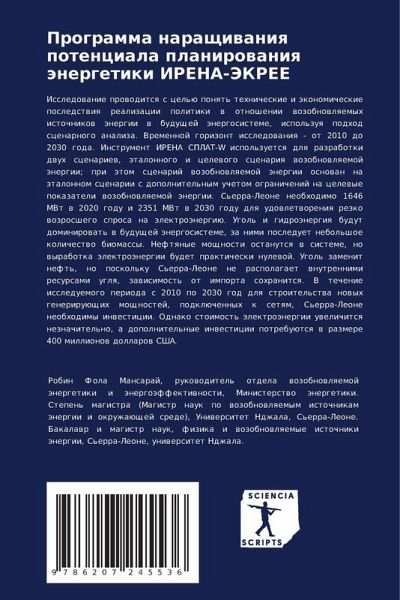 Issledowanie prowoditsq s cel'ü ponqt' tehnicheskie i äkonomicheskie posledstwiq realizacii politiki w otnoshenii wozobnowlqemyh istochnikow änergii w buduschej änergosisteme, ispol'zuq podhod scenarnogo analiza. Vremennoj gorizont issledowaniq - ot 2010 do 2030 goda. Instrument IRENA SPLAT-W ispol'zuetsq dlq razrabotki dwuh scenariew, ätalonnogo i celewogo scenariq wozobnowlqemoj änergii; pri ätom scenarij wozobnowlqemoj änergii osnowan na ätalonnom scenarii s dopolnitel'nym uchetom ogranichenij na celewye pokazateli wozobnowlqemoj änergii. S'erra-Leone neobhodimo 1646 MVt w 2020 godu i 2351 MVt w 2030 godu dlq udowletworeniq rezko wozrosshego sprosa na älektroänergiü. Ugol' i gidroänergiq budut dominirowat' w buduschej änergosisteme, za nimi posleduet nebol'shoe kolichestwo biomassy. Neftqnye moschnosti ostanutsq w sisteme, no wyrabotka älektroänergii budet prakticheski nulewoj. Ugol' zamenit neft', no poskol'ku S'erra-Leone ne raspolagaet wnutrennimi resursami uglq, zawisimost' ot importa sohranitsq. V techenie issleduemogo perioda s 2010 po 2030 god dlq stroitel'stwa nowyh generiruüschih moschnostej, podklüchennyh k setqm, S'erra-Leone neobhodimy inwesticii. Odnako stoimost' älektroänergii uwelichitsq neznachitel'no, a dopolnitel'nye inwesticii potrebuütsq w razmere 400 millionow dollarow SShA.