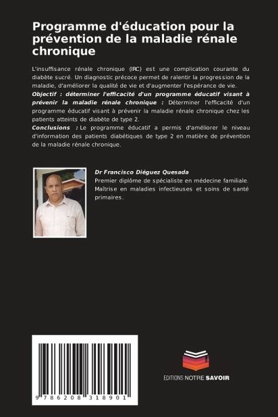 L'insuffisance rénale chronique (IRC) est une complication courante du diabète sucré. Un diagnostic précoce permet de ralentir la progression de la maladie, d'améliorer la qualité de vie et d'augmenter l'espérance de vie.Objectif : déterminer l'efficacité d'un programme éducatif visant à prévenir la maladie rénale chronique : Déterminer l'efficacité d'un programme éducatif visant à prévenir la maladie rénale chronique chez les patients atteints de diabète de type 2.Conclusions : Le programme éducatif a permis d'améliorer le niveau d'information des patients diabétiques de type 2 en matière de prévention de la maladie rénale chronique.