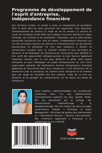 Ces dernières années, le monde a connu un changement de paradigme dans la façon dont les gens perçoivent leur gagne-pain. Pour beaucoup, l'entrepreneuriat est devenu un mode de vie et certains s'y lancent en raison de l'excitation et des défis qu'il implique et qui leur donnent un regain d'énergie, de confiance et de satisfaction. Cependant, seul un petit nombre d'aspirants transforme leur rêve en réalité. L'indépendance financière est l'un des principaux facteurs qui donnent à l'entrepreneuriat une perspective passionnante et attrayante. Ce livre vous préparera à devenir un entrepreneur prospère dans un contexte mondial et vous permettra de découvrir et de développer les connaissances nécessaires pour identifier et tirer profit des opportunités entrepreneuriales et vous fournira également l'expertise requise, que ce soit pour démarrer et gérer votre propre entreprise ou pour développer un projet entrepreneurial au sein d'une organisation existante. De nombreuses femmes entrepreneurs émergent également et réussissent dans leurs entreprises. Il est nécessaire de se familiariser avec le processus de création d'une entreprise et la manière dont une étude de faisabilité doit être réalisée. L'idée de ce livre est d'éclairer et de partager les connaissances sur les bases du monde de l'entreprise.