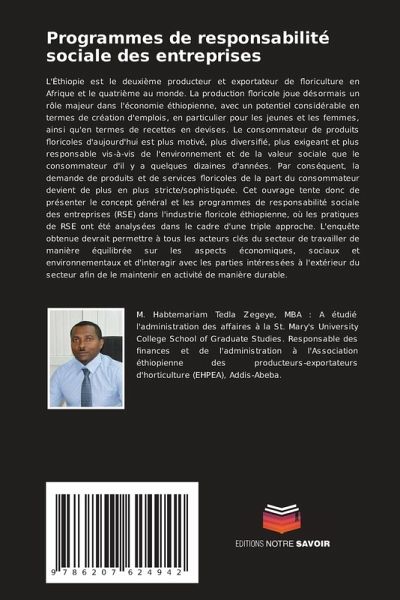 L'Éthiopie est le deuxième producteur et exportateur de floriculture en Afrique et le quatrième au monde. La production floricole joue désormais un rôle majeur dans l'économie éthiopienne, avec un potentiel considérable en termes de création d'emplois, en particulier pour les jeunes et les femmes, ainsi qu'en termes de recettes en devises. Le consommateur de produits floricoles d'aujourd'hui est plus motivé, plus diversifié, plus exigeant et plus responsable vis-à-vis de l'environnement et de la valeur sociale que le consommateur d'il y a quelques dizaines d'années. Par conséquent, la demande de produits et de services floricoles de la part du consommateur devient de plus en plus stricte/sophistiquée. Cet ouvrage tente donc de présenter le concept général et les programmes de responsabilité sociale des entreprises (RSE) dans l'industrie floricole éthiopienne, où les pratiques de RSE ont été analysées dans le cadre d'une triple approche. L'enquête obtenue devrait permettre à tous les acteurs clés du secteur de travailler de manière équilibrée sur les aspects économiques, sociaux et environnementaux et d'interagir avec les parties intéressées à l'extérieur du secteur afin de le maintenir en activité de manière durable.