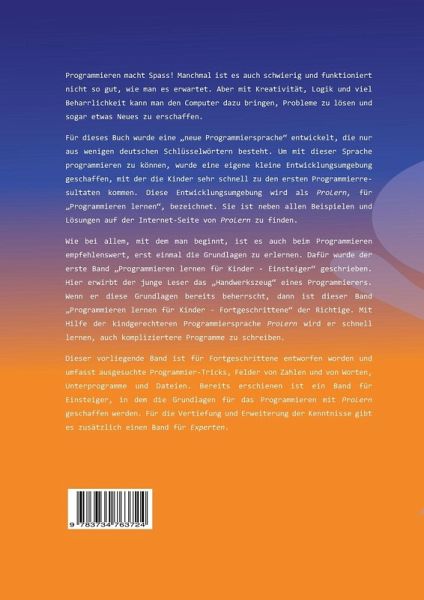 Programmieren macht Spass! Manchmal ist es auch schwierig und funktioniert nicht so gut, wie man es erwartet. Aber mit Kreativität, Logik und viel Beharrlichkeit kann man den Computer dazu bringen, Probleme zu lösen und sogar etwas Neues zu erschaffen. Für dieses Buch wurde eine "neue Programmiersprache" entwickelt, die nur aus wenigen deutschen Schlüsselwörtern besteht. Um mit dieser Sprache programmieren zu können, wurde eine eigene kleine Entwicklungsumgebung geschaffen, mit der die Kinder sehr schnell zu den ersten Programmierresultaten kommen. Diese Entwicklungsumgebung wird als ProLern, für "Programmieren lernen", bezeichnet. Wie bei allem, mit dem man beginnt, ist es auch beim Programmieren empfehlenswert, erst einmal die Grundlagen zu erlernen. Dafür wurde der erste Band "Programmieren lernen für Kinder - Einsteiger" geschrieben. Hier erwirbt der junge Leser das "Handwerkszeug" eines Programmierers. Wenn er diese Grundlagen bereits beherrscht, dann ist dieser Band "Programmieren lernen für Kinder - Fortgeschrittene" der Richtige. Mit Hilfe der kindgerechteren Programmiersprache ProLern wird er schnell lernen, auch kompliziertere Programme zu schreiben. Dieser vorliegende Band ist für Fortgeschrittene entworfen worden und umfasst ausgesuchte Programmier-Tricks, Felder von Zahlen und von Worten, Unterprogramme und Dateien. Bereits erschienen ist ein Band für Einsteiger, in dem die Grundlagen für das Programmieren mit ProLern geschaffen werden. Für die Vertiefung und Erweiterung der Kenntnisse gibt es zusätzlich einen Band für Experten.